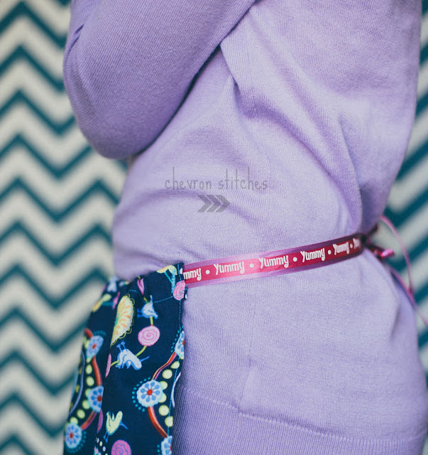 We put the DVD in and watched the whole thing before she started sewing to make sure we would be able to follow along. It was cute! I loved the little 'pixie' music that played through out the tutorials and how everything was pink. The color scheme went well with the Pixie Candy theme. It was definitely appealing to my daughter. There was even a section where Katrina {the maker of these DVD's} had a demonstration of one of the items with a little girl so you could see the whole process through kids eyes. In the DVD you have five projects to make - a pillow, a hair bow headband, a purse, a neck pillow, and an apron. Very simple and very appropriate projects for kids.